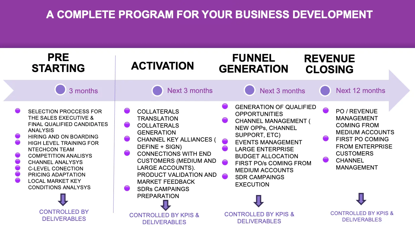 - >50% de reducción del tiempo del círculo de ventas : utilizando toda la estructura NTECHCON y la red C-Level, la empresa puede reducir significativamente el tiempo necesario para generar negocios con clientes empresariales medianos y grandes.